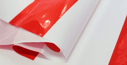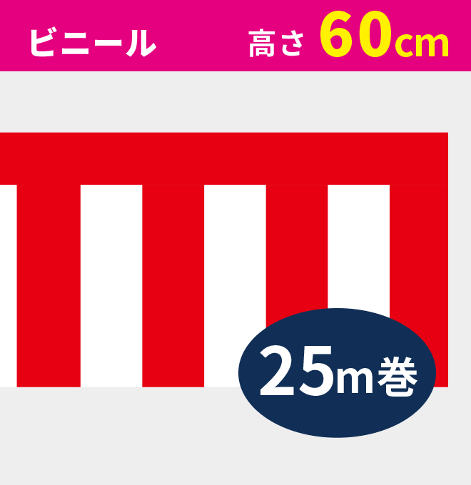 ビニール素材の生地は光沢があり、屋台やフードブースなどで使用した際に付く液体汚れも、さっと拭くだけで簡単にお手入れが可能です。 店頭やイベント会場などの案内での使用に便利な、25m巻きのロール状でお届けします。