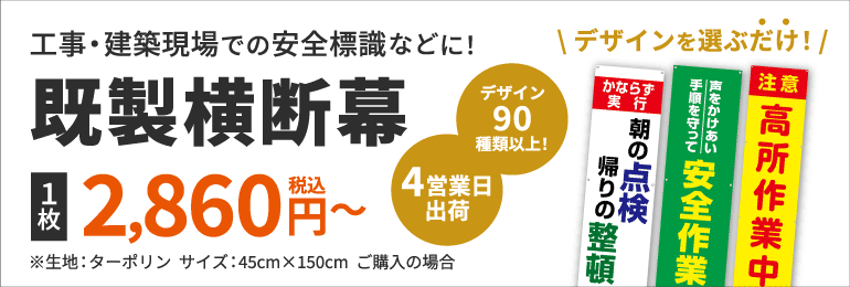 デザインが完成した既製の幕を販売中です。 営業中やイベント運営で使える幕と工事・建設現場で使える幕のデザインを取り揃えています。 仕様や生地が固定のためデザインを選ぶだけで簡単に早く注文が可能です。